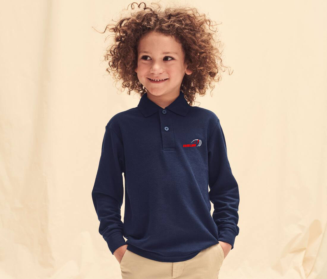 Polo enfant manches longues 180g/m² (170G pour la couleur WHITE) 35% coton 65% polyester Marque FRUIT OF THE LOOM ou équivalent selon stock disponible