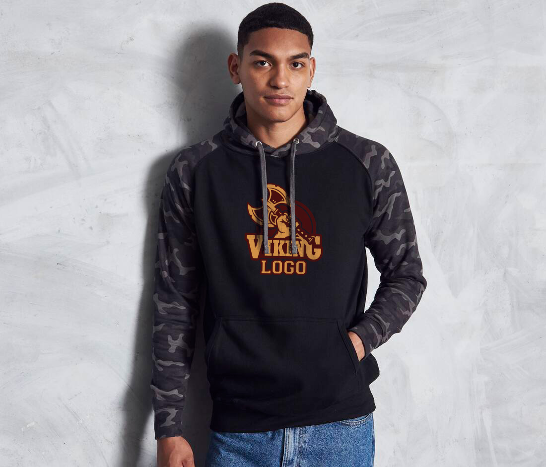 Manches raglan. Manches et capuche contrastées. Cordons plats contrastés. Capuche doublée. Double coutures.Poche kangourou. Ourlet et poignets en bords cote.