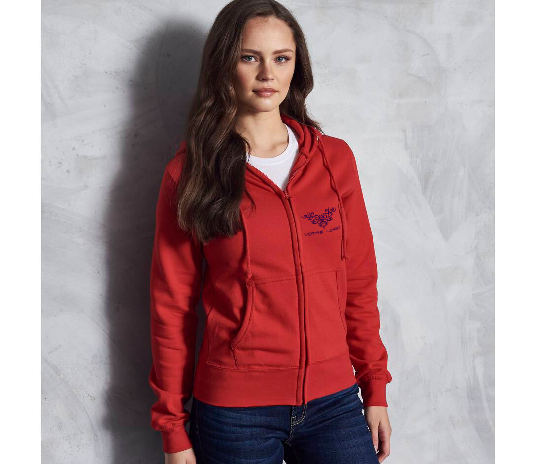 Grand zip. Zip invisible. Coupe féminine. Capuche doublée avec cordons ton sur ton. 2 poches frontales. Poignets et ourlet en bords côte.