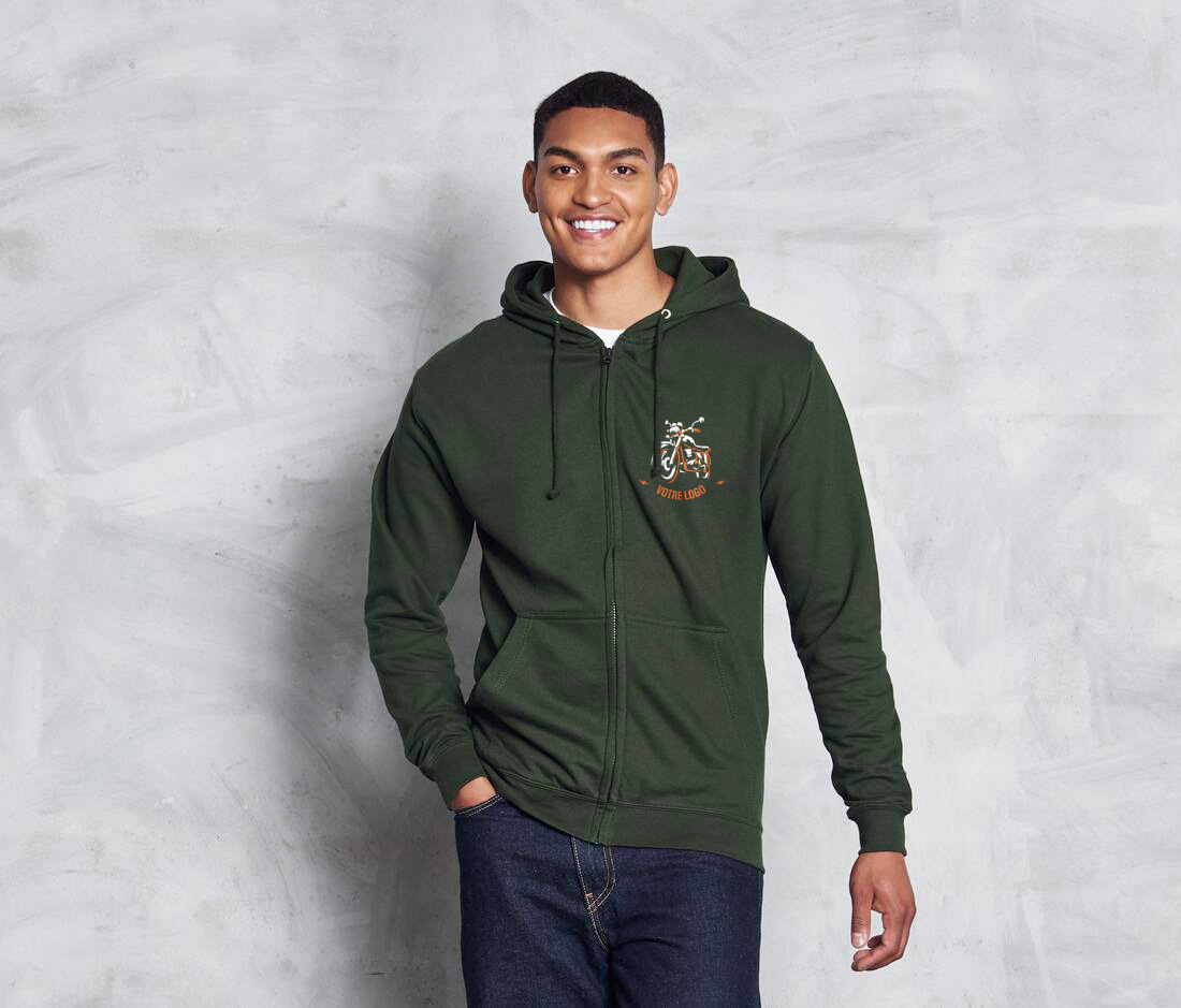 Le prix comprend la broderie de votre logo à l’avant et à l’arrière du sweat-shirt :